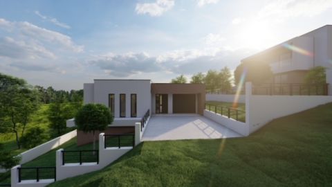 Földszint mely az utca szinttel megegyezik ,ott található a garázs nappali-konyha ,melyből a tetőteraszra jutunk ki és elénk tárul a gyönyörű panoráma.