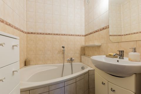 Átgondolt alaprajz: A különálló WC és a sarokkáddal felszerelt fürdőszoba mellett egy külön gardróbhelyiség is rendelkezésre áll. Itt kapott helyet a mosógép is, így a fürdő megőrizte tágas jellegét.